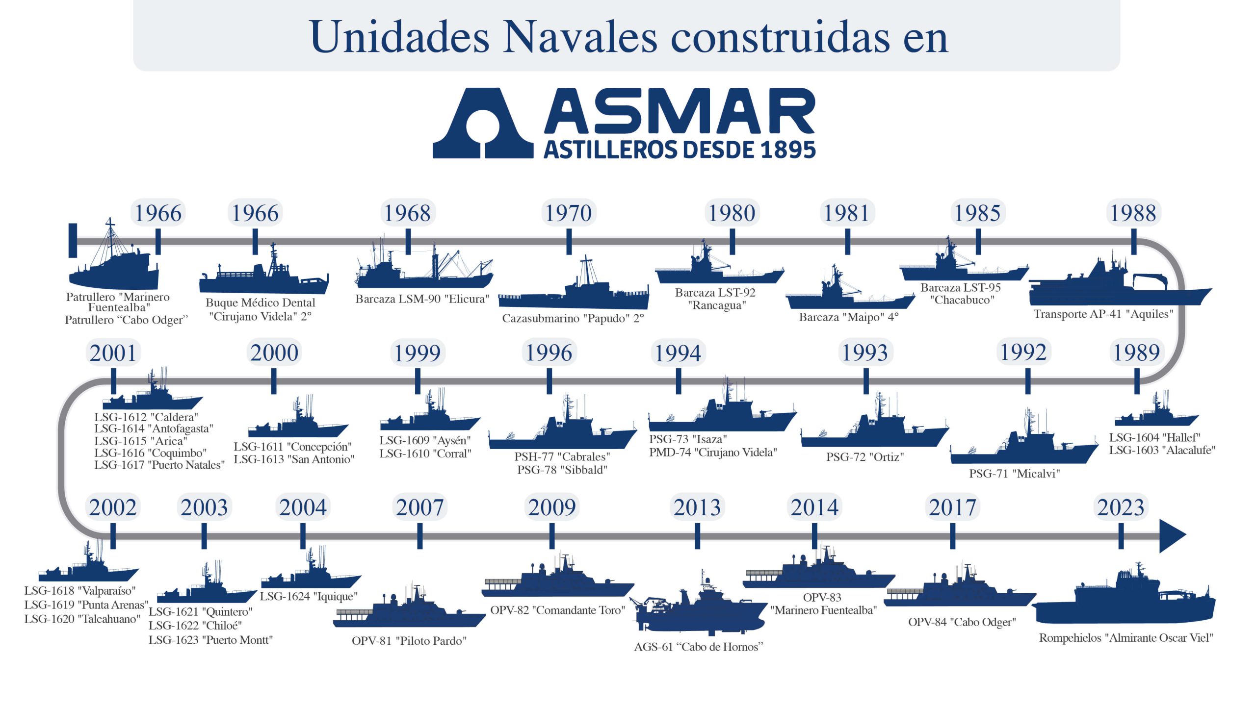 Todo comenzó con una lancha aguatera hasta llegar a importantes buques de alta mar, como el patrullero multipropósito “Thor” para el Servicio Guardacostas de Islandia o el OPV “Marinero Fuentealba” para la Armada de Chile. Cada uno de los buques entregados a nuestros clientes nacionales y extranjeros dan cuenta del éxito de la construcción naval en ASMAR y en el país.